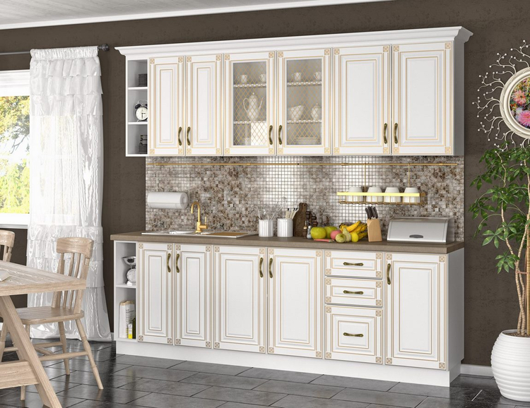 Kuchyně ve francouzském stylu. Tato kuchyně je navržena tak, že skříňky se dají poskládat v libovolném pořadí. To vám umožní si sestavit kuchyni podle svých představ. Korpus i sokl jsou z kvalitního lamina bílé barvy mat, dvířka z MDF v bílé mat se zlatým dekorem. Pracovní deska a horní okrasná věncová lišta nejsou v ceně. možnost dokoupení. Spotřebiče, dřez a digestoř nejsou součástí kuchyně.Sestava se skládá ze spodních skříněk – výška 82 cm, hloubka 44,5 cm, šířka: