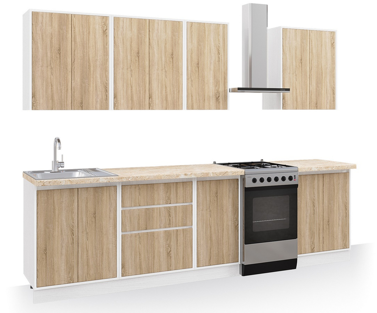 Tato moderní kuchyně kombinuje praktičnost a jednoduchý design. Skříňky se dají poskládat v libovolném pořadí a to Vám umožní si sestavit kuchyni podle svých představ. Korpus a sokl jsou z kvalitní LTD desky v barvě bílé, dvířka jsou v barvě dub sonoma. Dvířka mají bezúchytový systém... více informací o zboží