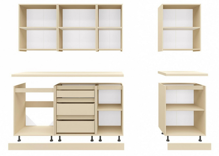 Sestava se skládá ze spodních skříněk – výška 82 cm, hloubka 47 cm, (s pracovní deskou výška 85 cm, hloubka 60 cm), šířka:
