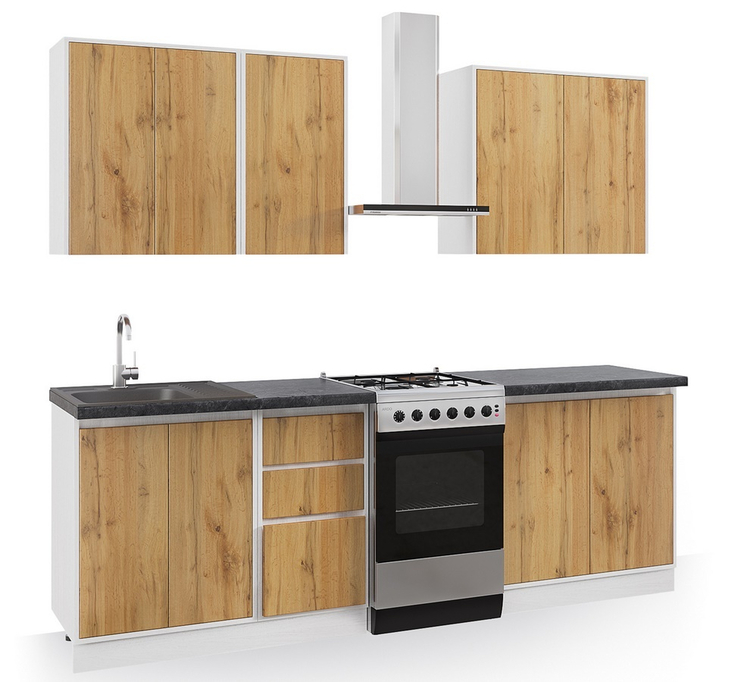 Tato moderní kuchyně kombinuje praktičnost a jednoduchý design. Skříňky se dají poskládat v libovolném pořadí a to Vám umožní si sestavit kuchyni podle svých představ. Korpus a sokl jsou z kvalitní LTD desky v barvě bílé, dvířka jsou v barvě apalačský dub. Dvířka mají bezúchytový systém... více informací o zboží