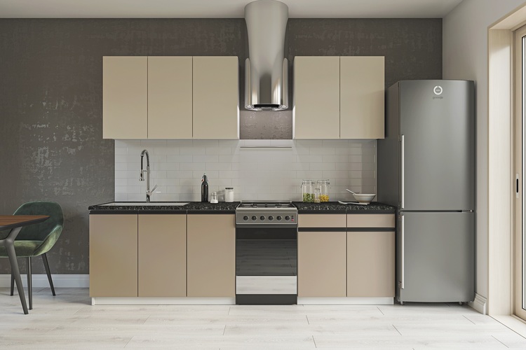 Kuchyňská linka 200 v jednoduchém moderním stylu.Materiál LTD, korpus je v bílé barvě, dvířka v barvě satin/clay grey mají integrované úchyty typu GOLA.