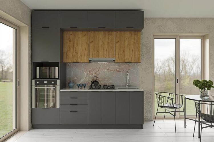Kuchyňská linka v elegantním a praktickém provedení s velkou spoustou úložného prostoru.Materiál LTD, korpus je v barvě grafit, dvířka jsou v barvách grafit a dub craft.