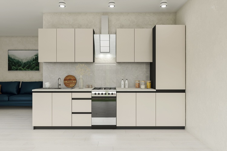 Kuchyňská linka 260 v elegantním stylu.Materiál LTD, korpus je v barvě grafit, dvířka v barvě satin mají integrované úchyty typu GOLA.