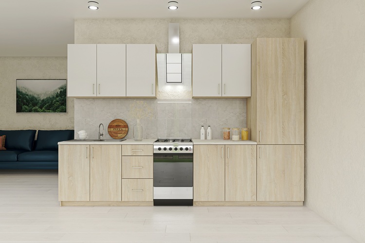 Kuchyňská linka 260 cm v jednoduché eleganci.Materiál LTD, korpus je v barvě dub sonoma, dvířka jsou v barvě bílé/dub sonoma. Úchyty jsou plastové, v saténové barvě.