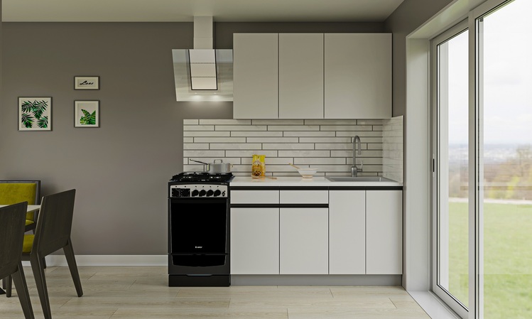 Moderní kuchyně, 140 cm je vhodná do menších interiérů.Materiál LTD, korpus je v šedé barvě, dvířka jsou v bílém provedení s integrovanými úchytkami.