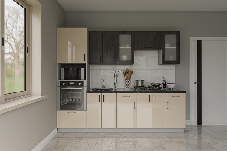 Moderní kuchyně 280 cm, která disponuje spoustou úložného prostoru.Materiál LTD, korpus je v bílé barvě, dvířka jsou v barvě slonová kost lesk/anglický dub. Úchyty jsou v barvě černé.
