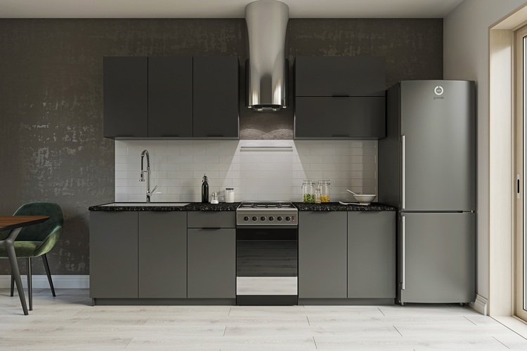 Moderní kuchyně, která vás zaujme svým praktickým a zároveň stylovým provedením. Kuchyňské skříňky jsou vyrobeny z kvalitních LTD desek. Korpus je v šedé barvě, dvířka jsou v barvě grafit. Kovové úchyty jsou v černé barvě.