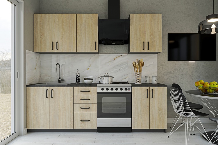 Kuchyňská linka180, vhodná také do menších prostorů.Materiál LTD, korpus je v barvě grafit, dvířka jsou v barvě dub sonoma, úchyty jsou v barvě černé.