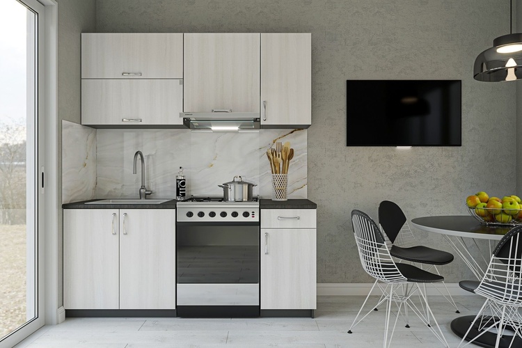 Kuchyňská linka 180, vhodná také do menších prostorů.Materiál LTD, korpus je v barvě grafit, dvířka jsou v barvě jasan surfside, úchyty jsou v saténové barvě.