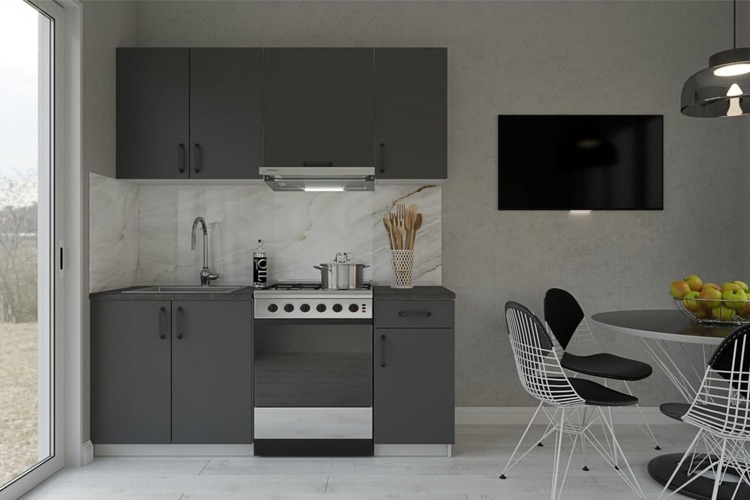 Kuchyňská linka180, vhodná také do menších prostorů.Materiál LTD, korpus je v šedé barvě, dvířka jsou v barvě grafit, úchyty jsou v černé barvě.