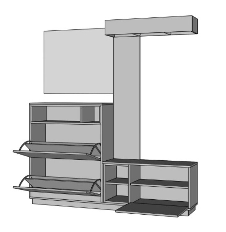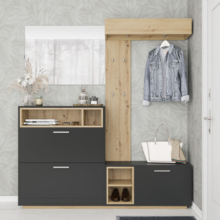 O stylový design Vaší vstupní části se postará moderní předsíňová sestava . Kombinace moderních barev jako dub Artisan v kombinaci s barvou antracit jí dodává jedinečný charakter. Za praktický rozměr sestavy jsou zodpovědné úložné prostory v podobě výklopných skříněk na boty. Snadný přístup ke kabátům zajišťuje věšáková tyč, která je připevněna k hornímu dílu předsíně.