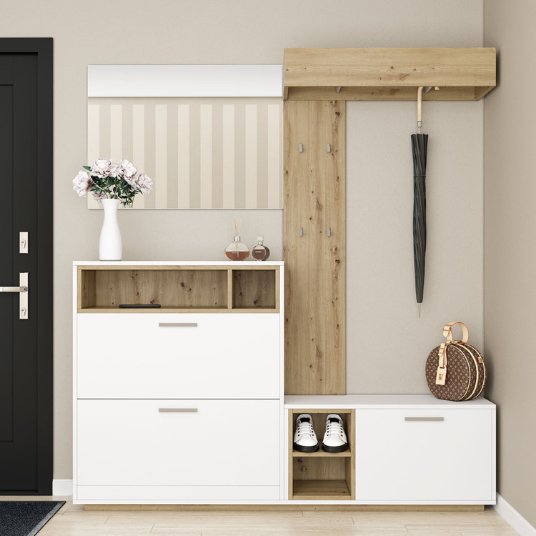 O stylový design Vaší vstupní části se postará moderní botník Kombinace moderních barev jako dub Artisan v kombinaci s bílou barvou jí dodává jedinečný charakter.