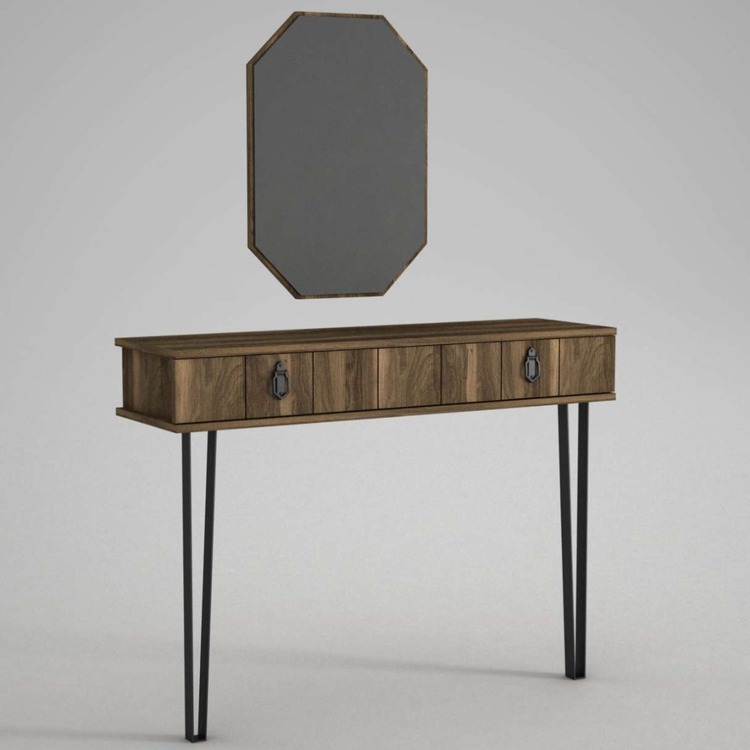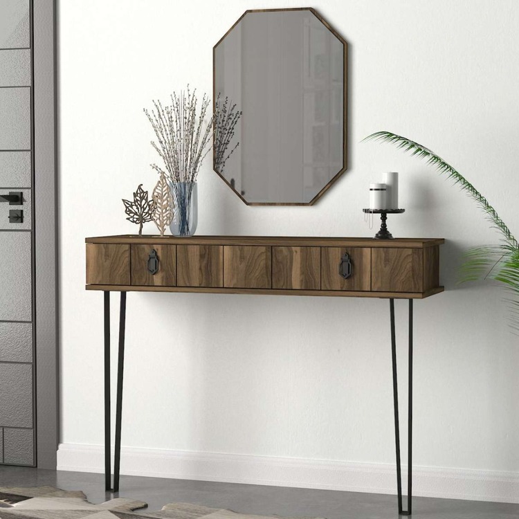 Konzolový stolek se svou kombinací ořechového dekoru a skleněných prvků stane skvělým doplňkem vašeho interiéru. Praktická zásuvka nabízí dostatek úložného prostoru, zatímco nástěnné zrcadlo opticky zvětšuje a prosvětluje místnost.