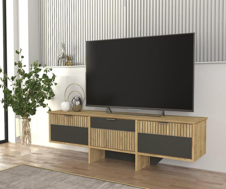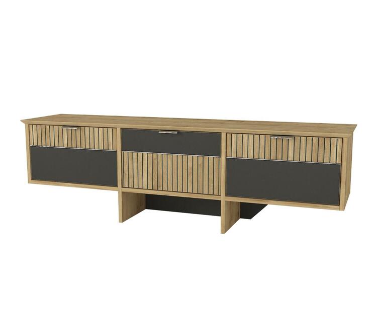 TV stolek nabízí dostatek úložného prostoru díky třem dvířkům, za kterými se nachází praktická skříňka. Je vyroben z kvalitního materiálu LTD s tloušťkou 18 mm, což zajišťuje jeho pevnost a dlouhou životnost. Kombinace šedé a světle hnědé barvy dodává vašemu obývacímu pokoji moderní a elegantní vzhled.