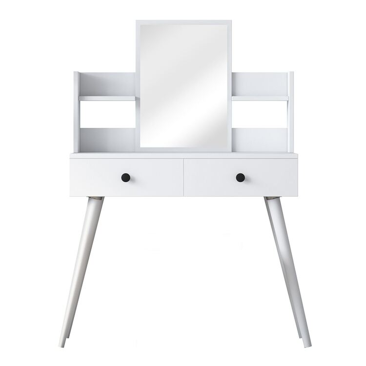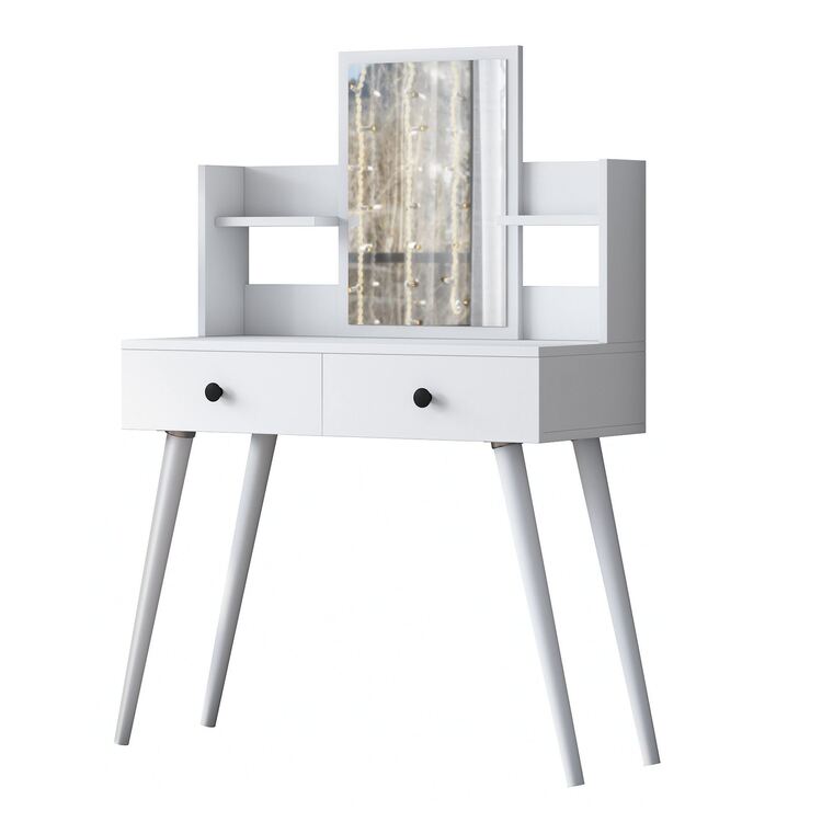 Toaletní stolek je ideálním doplňkem pro moderní ložnici. Díky svému skandinávskému designu a čistě bílé barvě přináší do prostoru svěžest a jednoduchost. Praktické zásuvky a velké zrcadlo zajišťují komfort a funkčnost při každodenním používání.