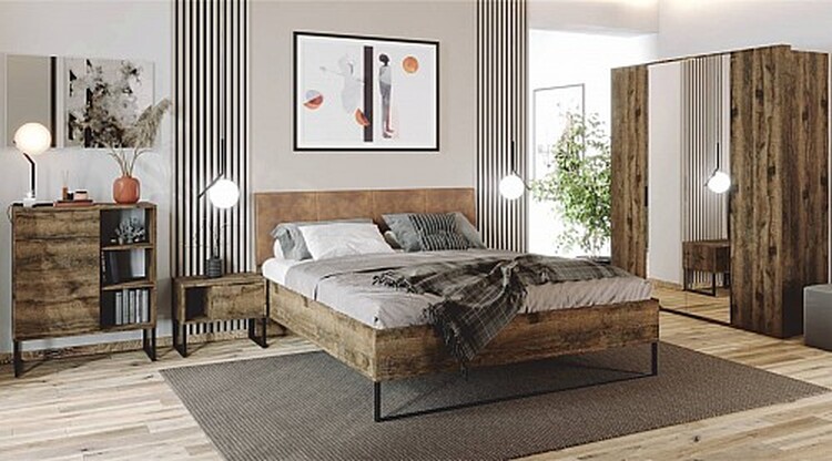 Moderní ložnice v provedení industriální styl: kov černý / dub