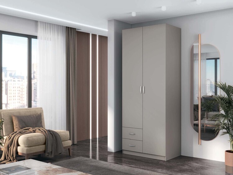 Obdélníkový tvar a praktická šířka 80 cm nabízí přehledné vnitřní uspořádání. Skříň je vybavena šatní tyčí,třemi policemi a dvěma zásuvkami, které poskytují dostatek místa pro uložení oblečení i doplňků. Provedení z materiálu LTD zaručuje snadnou údržbu a dlouhou životnost.