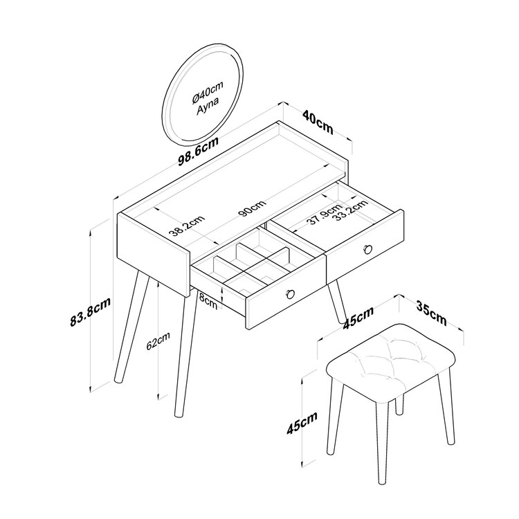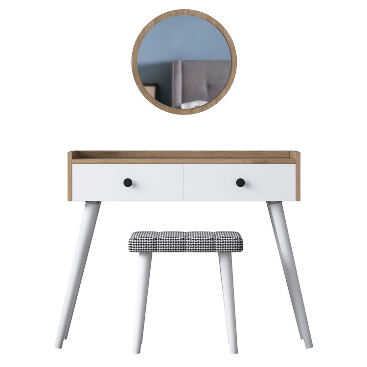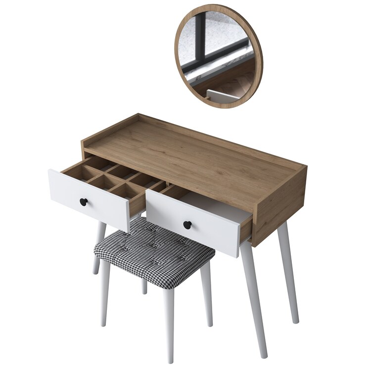Toaletní stolek je vybaven dvěma praktickými zásuvkami, které poskytují dostatek prostoru pro uložení kosmetiky, šperků nebo dalších nezbytností. Velké zrcadlo a pohodlná taburetka zajišťují maximální komfort při každodenní péči o váš vzhled.