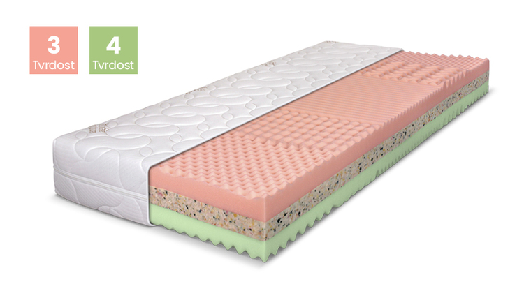 5zónová matrace. Mezi výrazně profilované vrstvypolyuretanové pěny je vložena deska z RE pěny,která zaručuje zvýšenou nosnost matrace. Odlehčeníexponovaných míst na těle zřetelně zlepšuje prokrvenípokožky a uvolnění svalů.