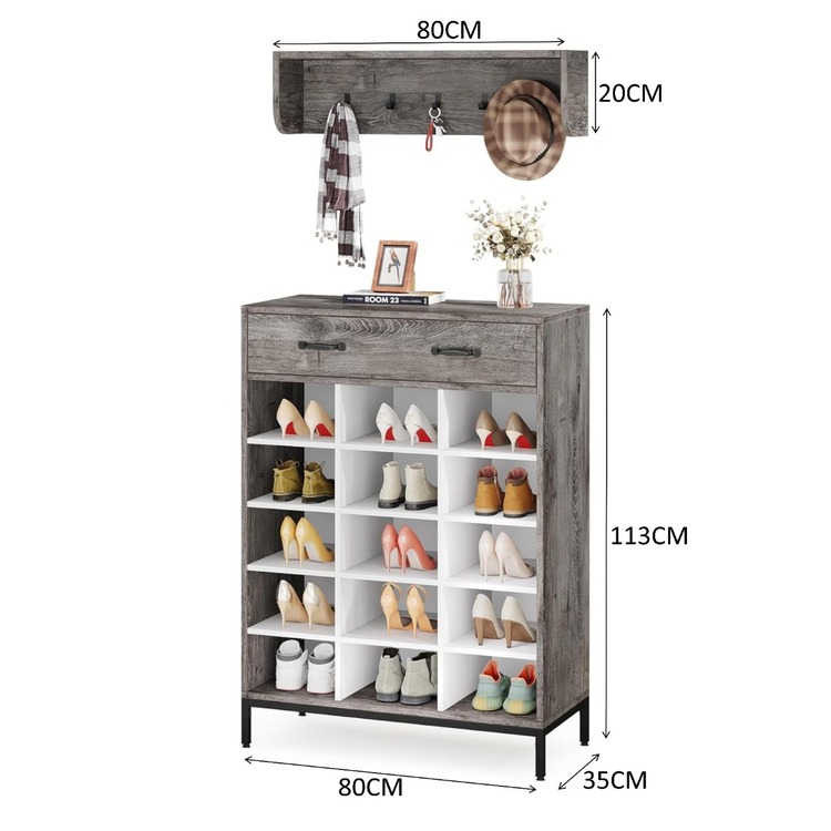 Předsíňová sestava se skládá z otevřeného botníku s 15ti přihrádkami, které nejsou výškově nastavitelné a police s věšáky. Jistě oceníte i zásuvku na drobnosti.