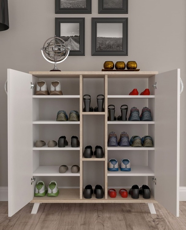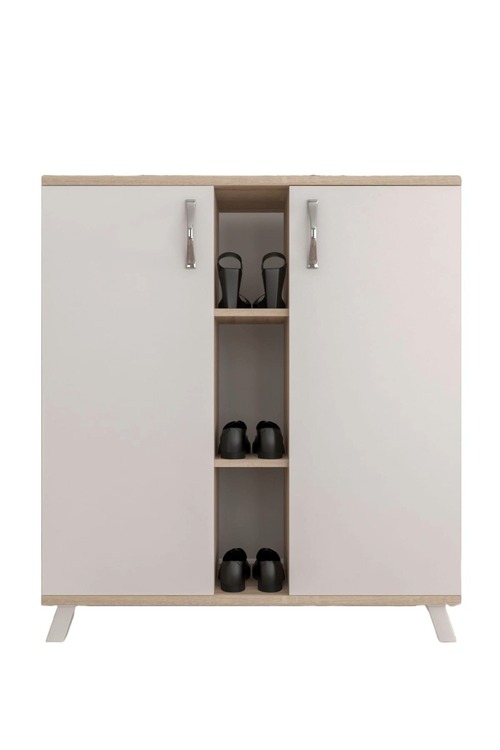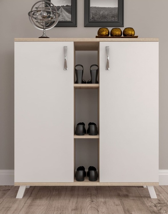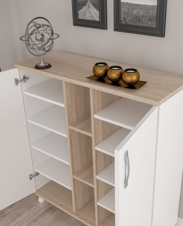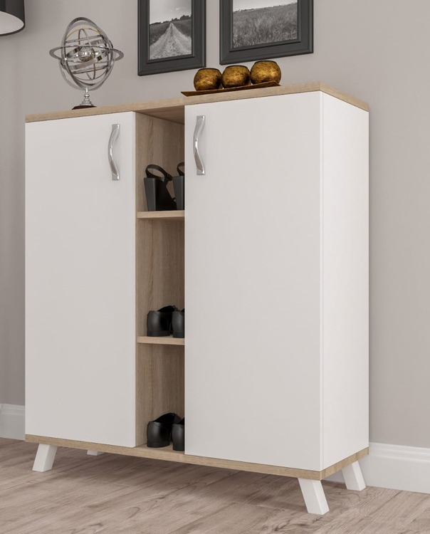 Botník je vybaven 2 dvířky, za kterými se nachází 4 police pro uspořádání vašich bot. Uprostřed jsou praktické volné regálky pro snadný přístup a uskladnění. Stojí na nožičkách, což usnadňuje údržbu podlahy pod ní. Vyrobena z kvalitní dřevotřísky potažené melaminem.