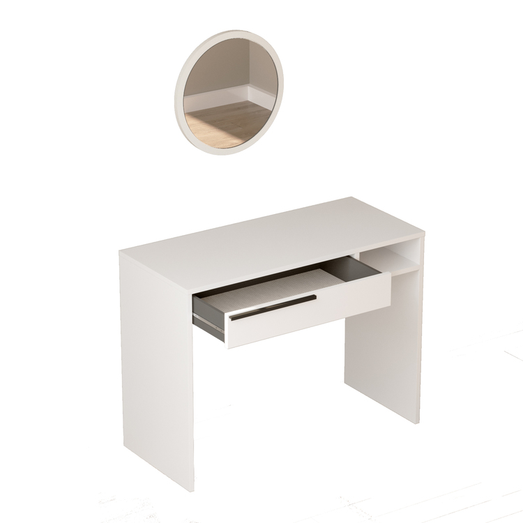 Toaletní stolek je perfektním doplňkem pro moderní ložnici. Vyrobený z kvalitního LTD materiálu nabízí odolnost, dlouhou životnost a stylový vzhled. Díky vybavení, které zahrnuje jednu zásuvku, regálek a kulaté zrcadlo, přináší tento stolek praktičnost a estetiku v jednom.