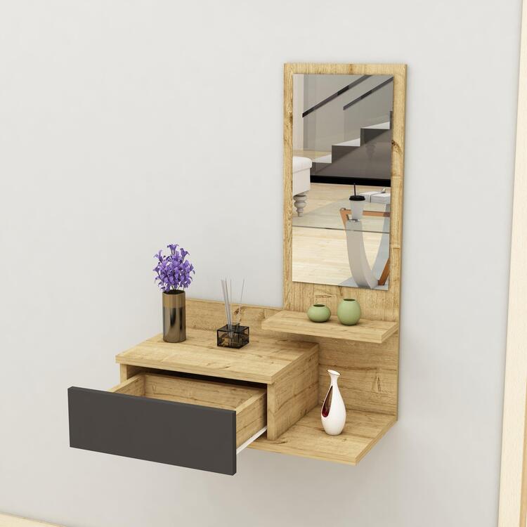 Stolek je navržen pro moderní předsíně, kde je klíčové efektivní využití prostoru a estetika. Tento závěsný odkládací stolek nabízí praktické vybavení v podobě zásuvky, odkládací police a integrovaného zrcadla, které vám usnadní každodenní organizaci a přidá styl vašemu interiéru.