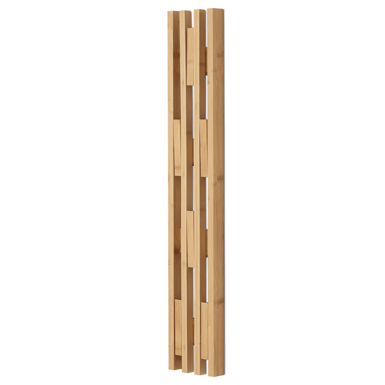 Nástěnný věšák z masivního bambusu v přírodním odstínu nabízí praktické a prostorově úsporné řešení pro zavěšení oděvů či doplňků. Skládací design umožňuje snadné rozložení a opětovné složení podle potřeby, což šetří místo v interiéru. Věšák je tvořen čtyřmi vertikálními lištami s pevně připevněnými háčky, které jsou rozmístěny ve třech úrovních pro pohodlné zavěšení různých předmětů. Bambusové provedení zajišťuje pevnost a stabilitu, zároveň materiál snadno udržuje přirozený vzhled a je odolný vůči běžnému opotřebení. Kompaktní rozměry a jednoduchý montážní systém umožňují jeho využití v předsíních, koupelnách nebo kancelářích.