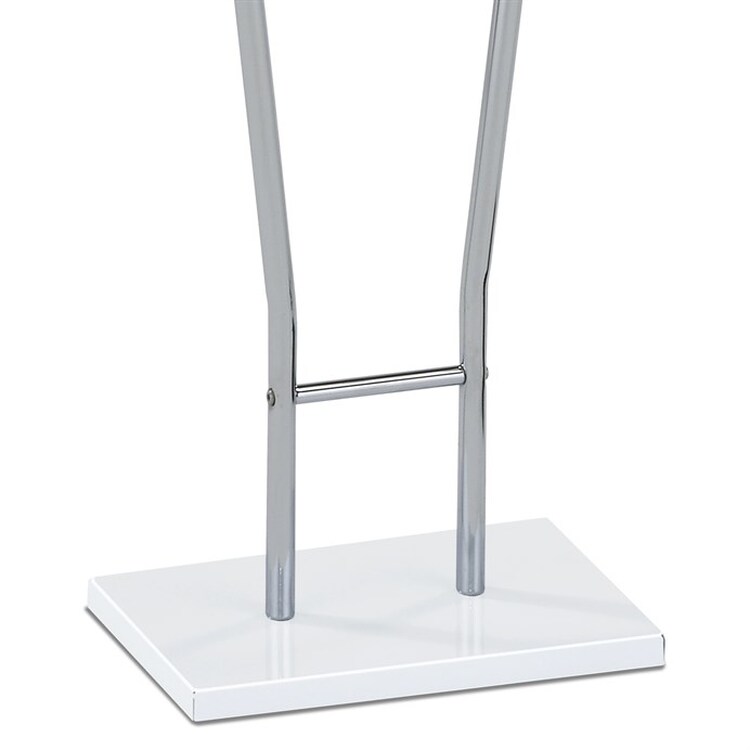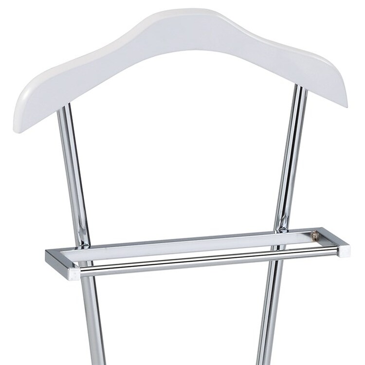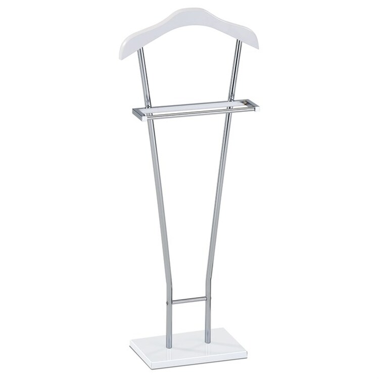 Praktický němý sluha v moderním designu. Konstrukce je kombinací kovových trubek s kovovou podestou a masivního ramene. Povrchová úprava je v bílém matném laku a chromu. Výška 110 cm Vám umožní zavěšení oblečení i doplňků bez pomačkání. Nosnost stojanu je až 6 kg, hmotnost necelé 4 kg. Proto je jednoduše přenositelný a lze ho umístit podle momentální potřeby i nálady. Stylem a jednoduchostí se hodí do jakéhokoli interiéru. Využití je nepřeberné, záleží jen na Vás.