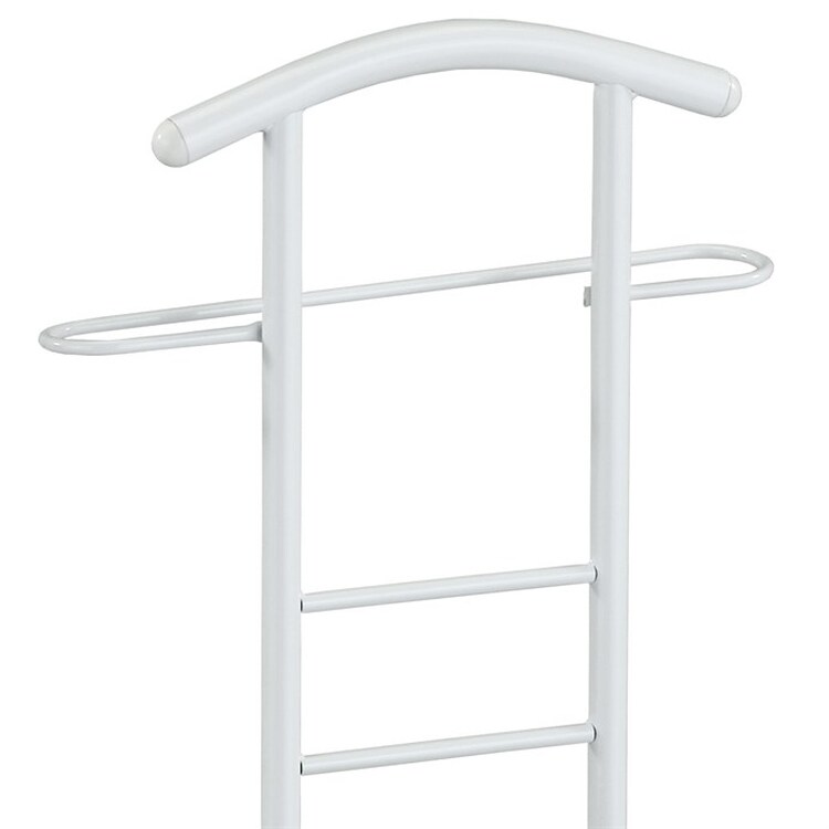 Němý sluha v bílém laku kombinuje kovové tělo s praktickým sedákem z MDF v dekoru černý dub, který dodává celku příjemný kontrast. Výška 119 cm nabízí dostatek prostoru pro zavěšení oděvů či doplňků, zatímco pevná kovová základna zajišťuje stabilitu a nosnost až 90 kg. Design s několika příčkami umožňuje efektivní uspořádání oblečení a doplňků, což z něj činí funkční doplněk do ložnice či předsíně. Povrchová úprava kovu bílým práškovým lakem přispívá k dlouhé životnosti a snadné údržbě. Díky kompaktním rozměrům je vhodný i do menších prostor.