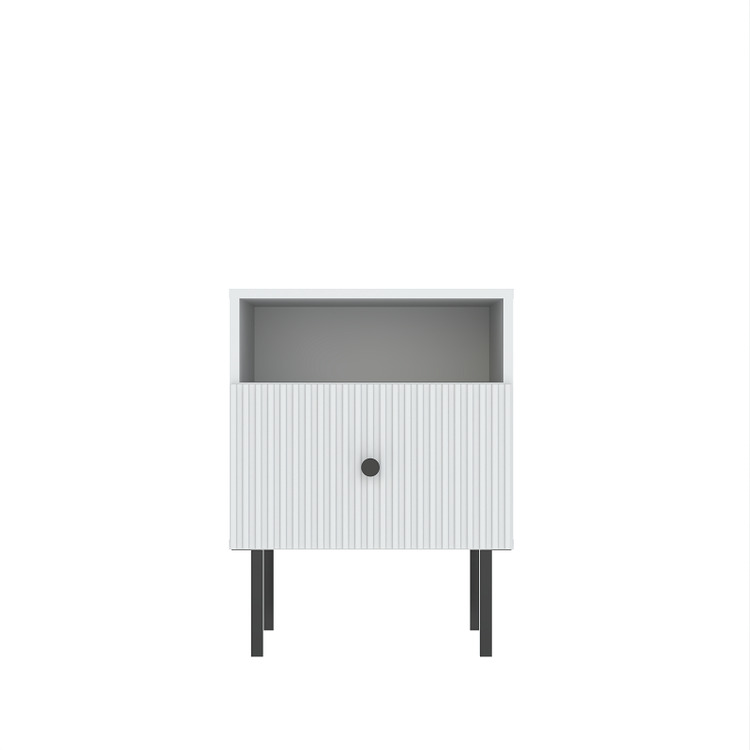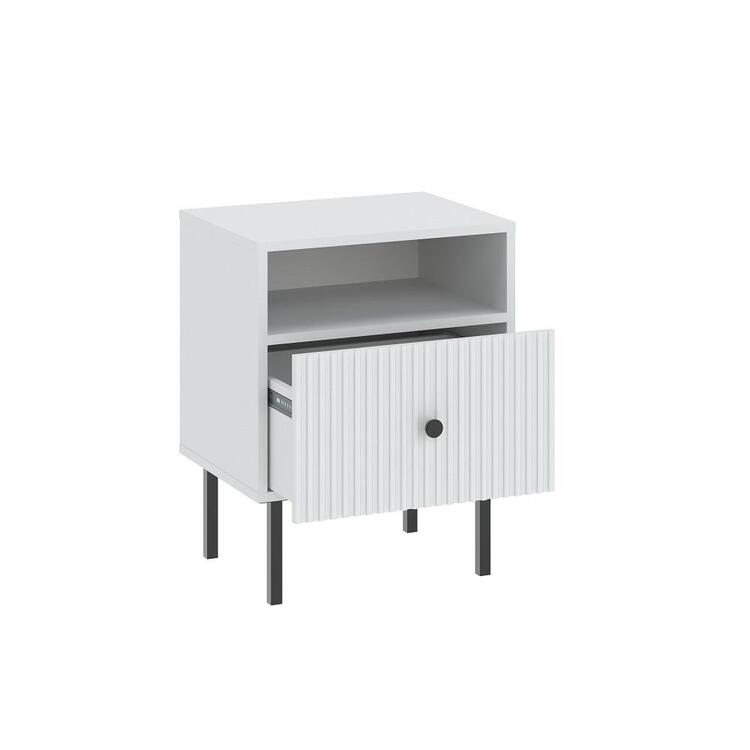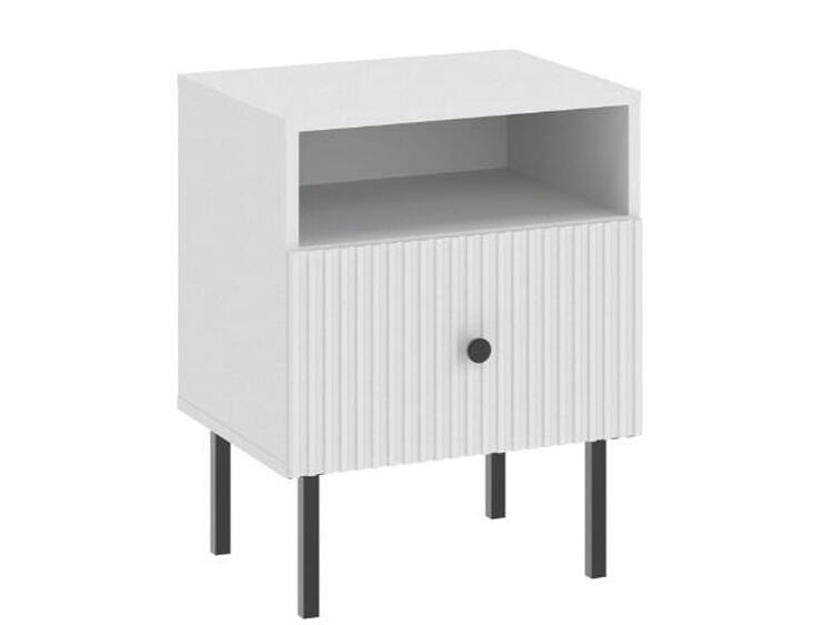 Noční stolek se zásuvkou v elegantním stylu, je vyroben z kvalitní LTD desky v barevném provedení bílá. Přední část nábytku je doplněna dekorem frézovaných dveří. Vysoké kovové nožky nábytku a úchyty jsou v barevném provedení černá. V naší nabídce naleznete více variant nábytku této řady.... více informací o zboží