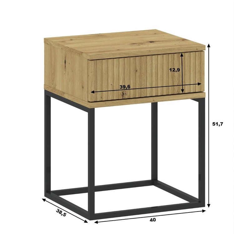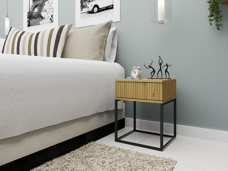 Noční stolek se zásuvkou v loftovém provedení je vyroben z kvalitní LTD desky s ABS hranami v barevném provedení dub artisan. Netradiční provedení kovové konstrukce nahrazující nožky stolku, je vyrobena z kovu v barvě černé. V nabídce najdete i další noční stolky v jiných provedeních. Dodáváme v demontovaném stavu.CASA 85026