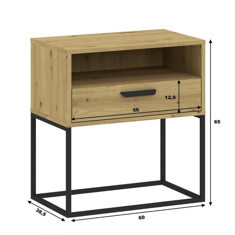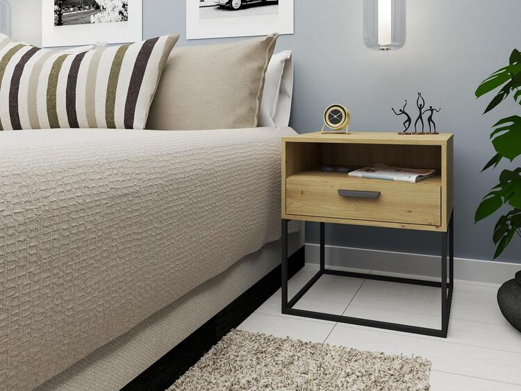 Noční stolek se zásuvkou v loftovém provedení je vyroben z kvalitní LTD desky s ABS hranami v barevném provedení dub artisan. Netradiční provedení kovové konstrukce nahrazující nožky stolku, je vyrobena z kovu v barvě černé. V nabídce najdete i další noční stolky v jiných provedeních. Dodáváme v demontovaném stavu.CASA 85026