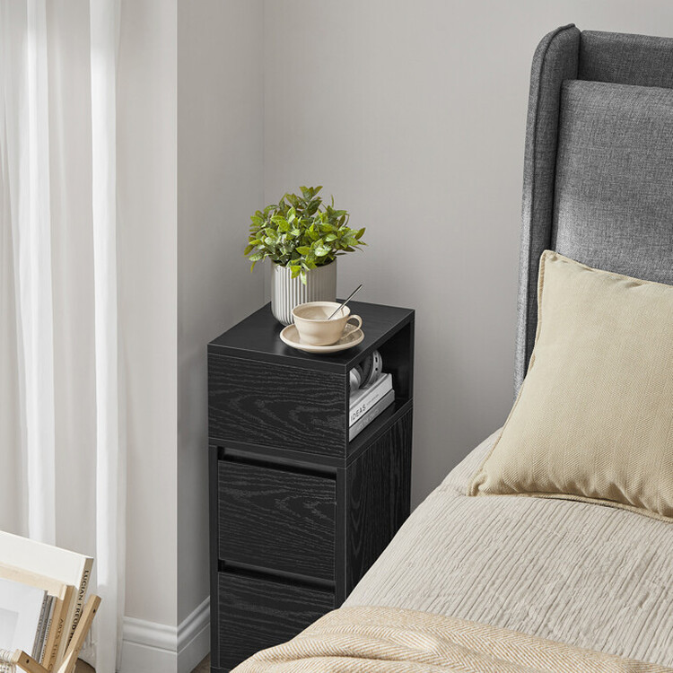 Noční stolek o rozměrech 25×30×65 cm je vyroben z MDF s matnou povrchovou úpravou v černém dekoru dřeva, která zajišťuje snadnou údržbu a odolnost proti běžnému opotřebení. Jeho kompaktní tvar nabízí praktický úložný prostor v otevřené přihrádce i za dvířky, což umožňuje efektivní organizaci drobných předmětů. Stolek má minimalistický design s čistými liniemi a decentními úchytkami, které podtrhují jeho moderní vzhled. Díky pevné konstrukci a stabilní základně je vhodný pro použití v ložnici i dalších interiérech, kde je potřeba praktický a nenáročný doplněk.