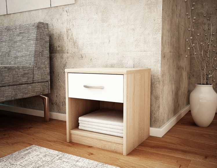 Noční stolek stolek v moderním provedení. Korpus i dvířka jsou z kvalitní LTD v barvě dub sonoma, dvířka pak bílé matné barvy. Lamino je odolné vůči vysokým teplotám, poškrábání a nárazům, hraněné ABS páskou. Stolek obsahuje 1 praktickou zásuvku. Jasně viditelná struktura dřeva. Dodáváme v... více informací o zboží