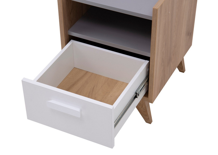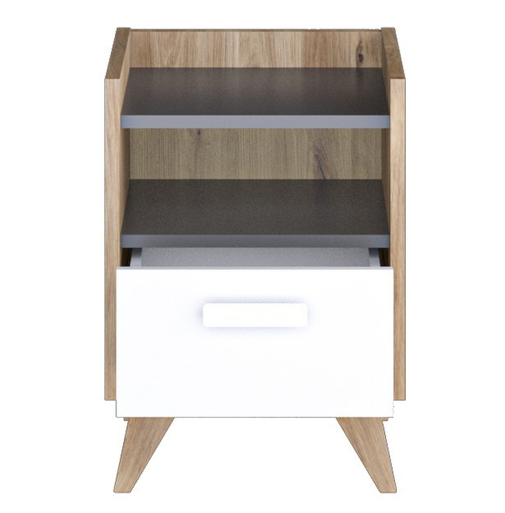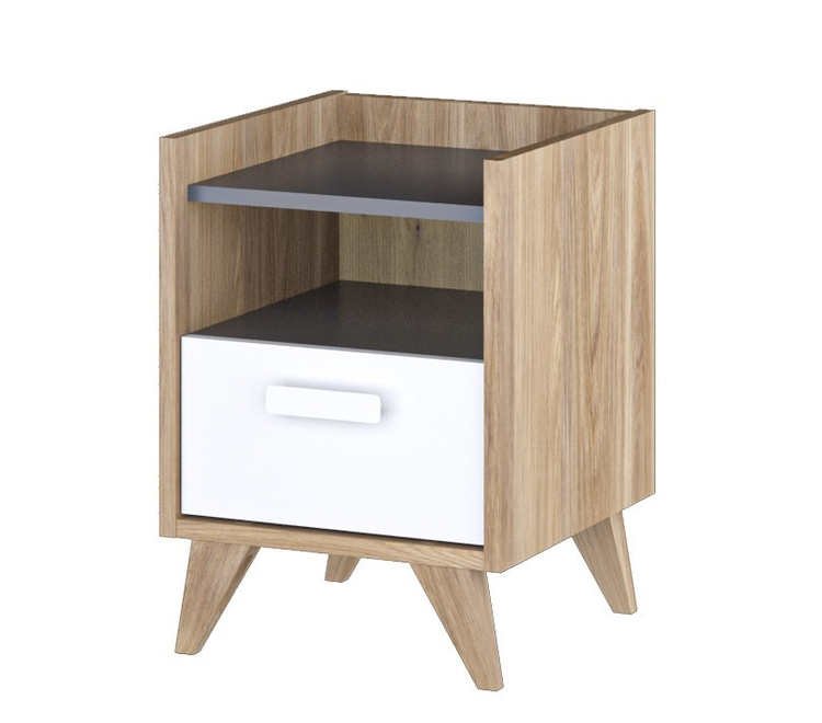 Noční stolek se zásuvkou v moderním stylu a geometrických tvarech. Nábytek je vyroben z desky LTD hraněné páskou ABS, korpus je v barvě dub castello medový, zásuvka je v barvě bílá alpská. Snížená horní deska je v barvě šedá a zabraňuje padání věcí ze stolku. Nožky mají netradiční zkosený... více informací o zboží