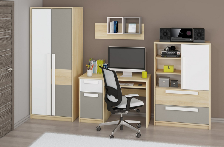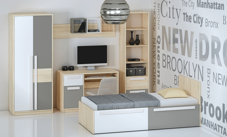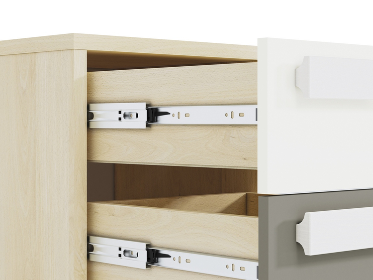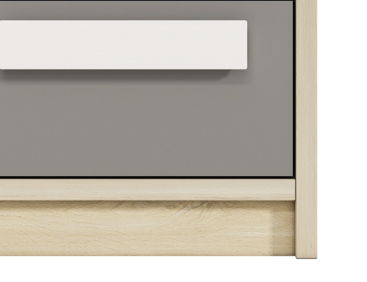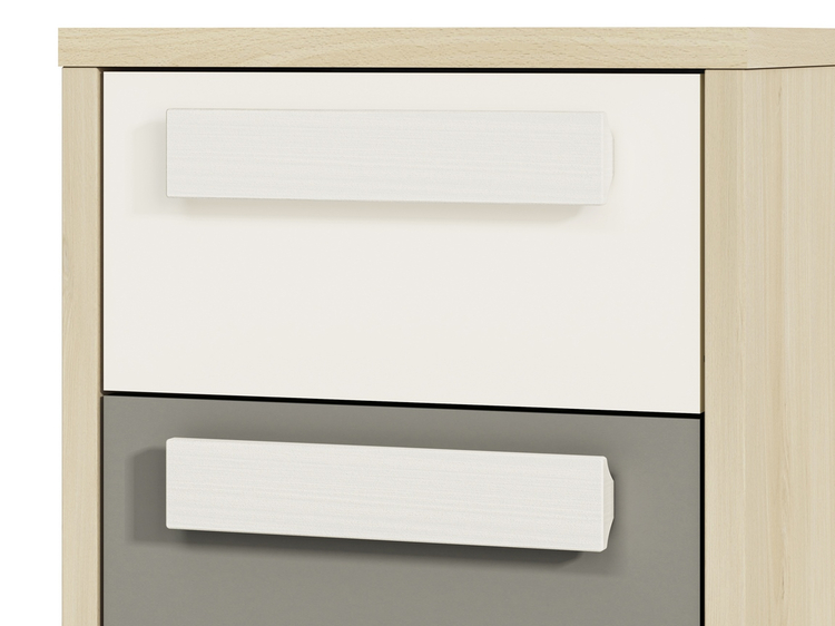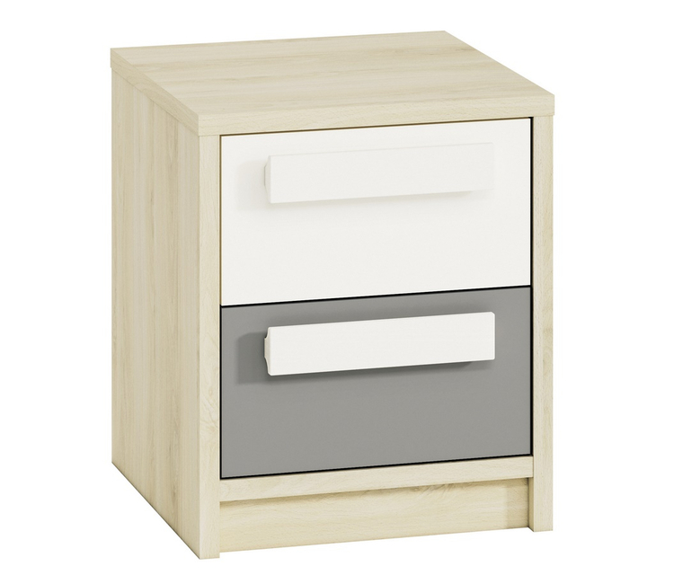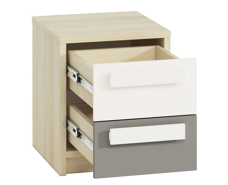 Noční stolek se dvěma zásuvkami v moderním provedení. Korpus je vyroben z kvalitní desky LTD hraněné ABS páskou v barvě buk fjord, zásuvky jsou vyrobeny z desky LTD v kombinaci barev bílá/šedá. Úchyty jsou dřevěné bílé. Dodáváme v demontovaném stavu.CASA 56010