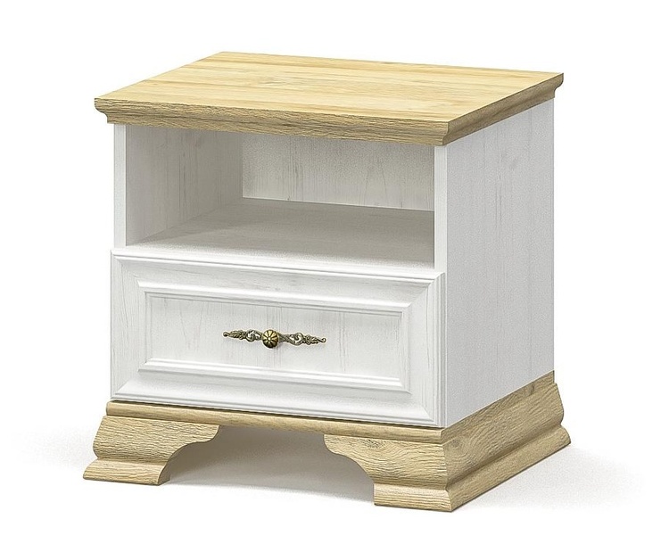 Noční stolek se zásuvkou ze sektorové řady nábytku v romantickém stylu. Nábytek je vyroben z kvalitní LTD v kombinaci s MDF v barevné kombinaci borovice andersen/zlatý dub. V naší nabídce najdete další jednotlivé prvky tohoto nábytku, ze kterého si můžete zařídit obývací pokoj dle vlastních potřeb. Dodáváme v demontovaném stavu.CASA 97011
