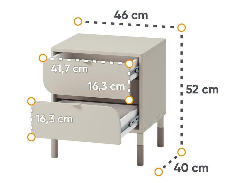 Noční stolek se dvěmi zásuvkami. Nábytek pro teenagery, který díky něžnosti hlavně ocení divky, nabízí moderní a praktické řešení do pokojů. Kombinace kašmírové a lanýžové barvy vytváří elegantní a univerzální design. Vyniká zaoblenými čely, asymetrickým stylem a štíhlými nožkami, které dodávají lehký vzhled. Vyroben je z odolné laminované desky o tloušťce 16 mm, zadní stěna je z HDF desky o tloušťce 3 mm. Jemné úchyty jsou kuličkové vyrobené z plastu. Ideální volba pro stylový a funkční prostor. Dodáváme v demontovaném stavu.