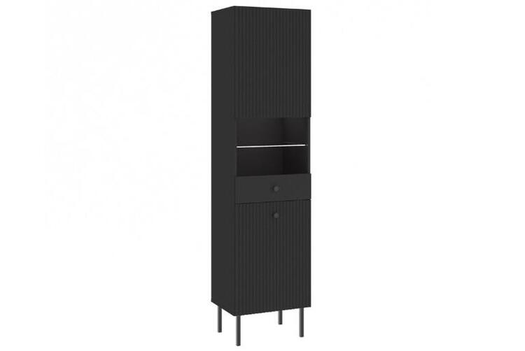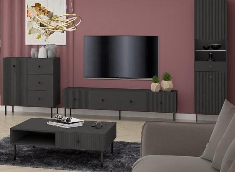 Sestava do obývacího pokoje v elegantním stylu, je vyrobena z kvalitní LTD desky v barevném provedení antracit. Přední část nábytku je doplněna dekorem frézovaných dveří. Vysoké kovové nožky nábytku a úchyty jsou v barevném provedení antracit. Sestava se skládá z těchto položek (Š x V x H cm):