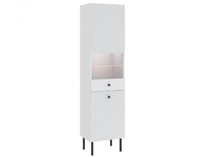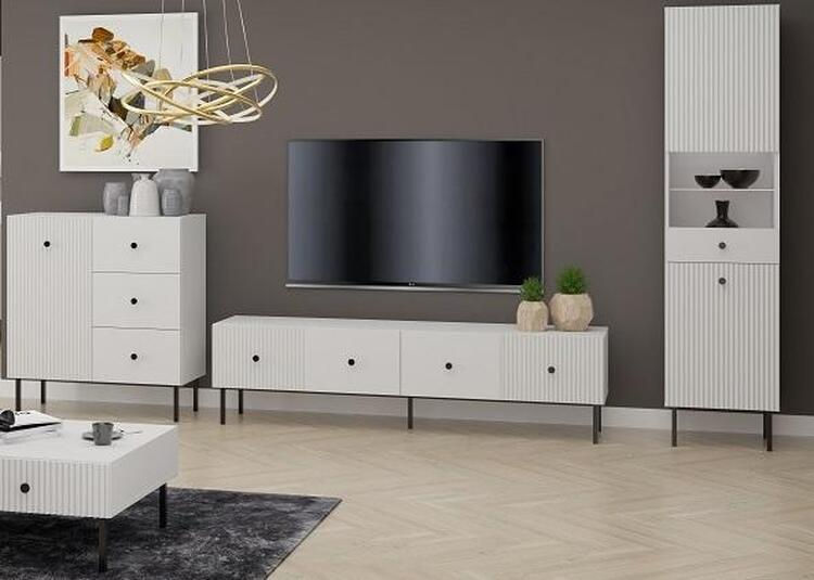 Sestava do obývacího pokoje v elegantním stylu, je vyrobena z kvalitní LTD desky v barevném provedení bílá. Přední část nábytku je doplněna dekorem frézovaných dveří. Vysoké kovové nožky nábytku a úchyty jsou v barevném provedení černá. Sestava se skládá z těchto položek (Š x V x H cm):