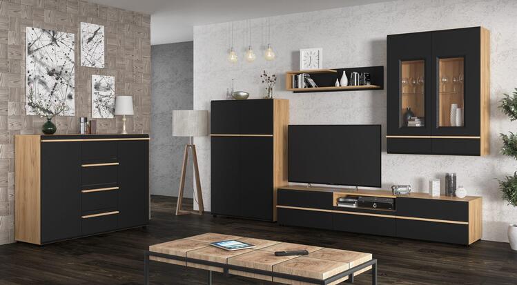 Obývací sestava v moderním provedení. Korpus je vyroben z kvalitní desky LTD v barvě buk, dvířka a čela zásuvek jsou vyrobeny z desky MDF v barevném provedení černá textura. Úchyty jsou z přírodního bukového dřeva. Sestava se skládá z těchto položek ( Š x V x H cm): televizní stolek (205 × 41,5 × 48 cm),závěsná vitrína 2D (90 × 118 × 36,5 cm),závěsná police (110 × 25 × 23 cm),policová skříň (90 × 140 × 36,5 cm). Komoda se zásuvkami není součástí sestavy, je možné ji dokoupit zvlášť. Dodáváme v demontovaném stavu.CASA 97045