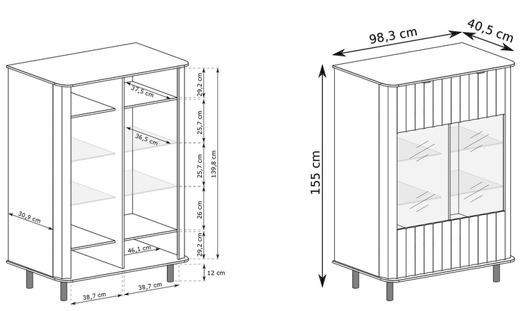 Sestava se skládá – jednodvéřová vitrína, dvoudveřová vitrína a