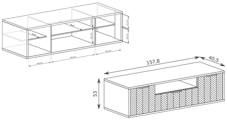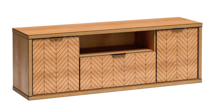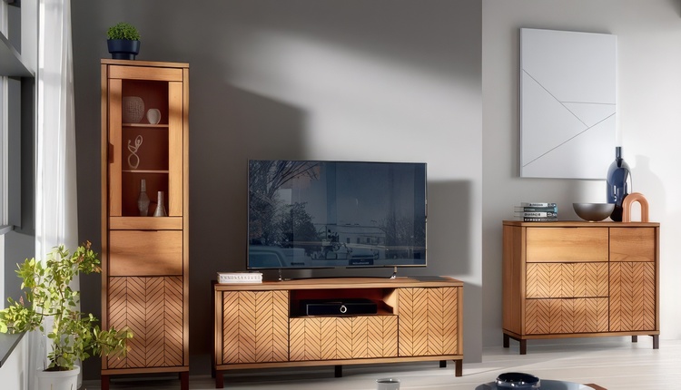 Obývací sestava: komoda 1-dveřová se 3 zásuvkami, vitrína 2-dveřová se zásuvkou a televizní stolek 2-dveřový se zásuvkou a úložným prostorem.