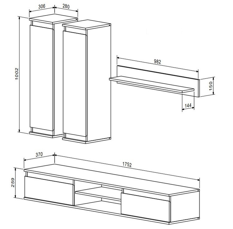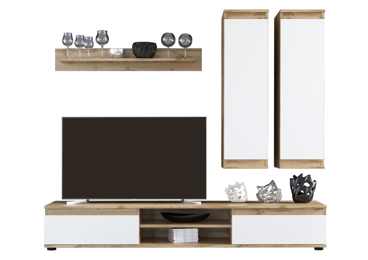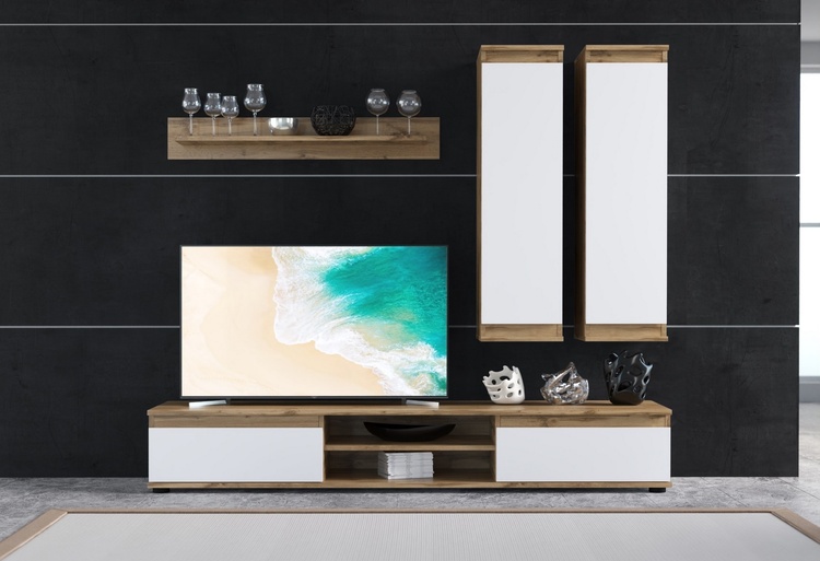 Obývací stěna se vyznačuje stylovým designem a moderní barevné provedení ozdobí váš obývací pokoj. Sestava se skládá – televizní stolek- výška/šířka/výška – 29/175/37 cm (dvoje výklopné dvířka),police – šířka – 99 cm a 2× závěsné skříňky – výška/šířka/výška – 100/30/28 cm (uvnitř dvě police).... více informací o zboží