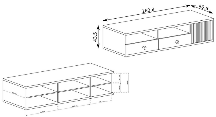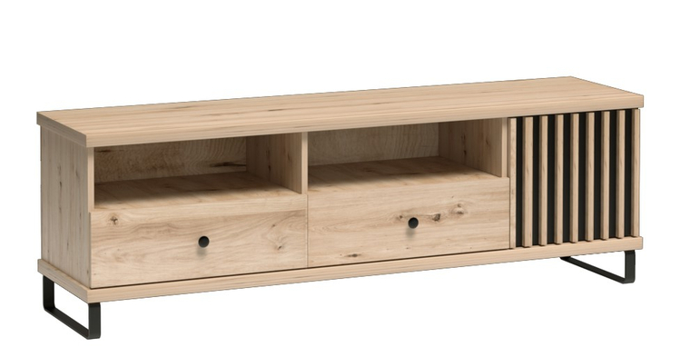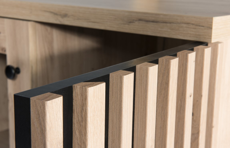 Obývací sestava s netradičním provedením detailu dvířek s lamelami. Kolekce nábytku v sobě spojuje jednoduchost, originální vzhled a funkčnost. Barevné provedení je v kombinaci dub artisan/černá mat. Sestava se skládá z těchto položek (Š x V x H cm) – vitrína dvoudveřová se zásuvkami (86,4 × 201 × 40,6 cm),televizní stolek (160,6 × 53,4 × 40,6 cm a závěsný panel (80 × 148 × 3,2 cm). Nábytek je vyroben z kvalitního lamina ohraničeného ABS páskou, dekorační lamely jsou vyrobeny z desky MDF. Zásuvky jsou vybaveny kovovými pojezdy se systémem tichého dovírání. Sestava je doplněna kovovými nohami v černé barvě. Kolekce se skládá z mnoha prvků a tento široký výběr Vám zaručí sestavit si nábytek podle svých vlastních představ a přání. Možnost dokoupení LED osvětlení. Dodáváme v demontovaném stavu.CASA 71023