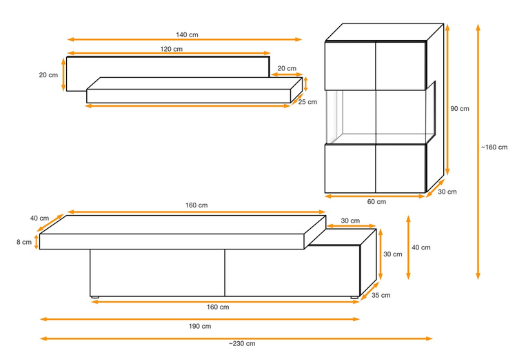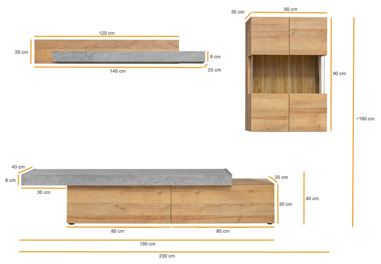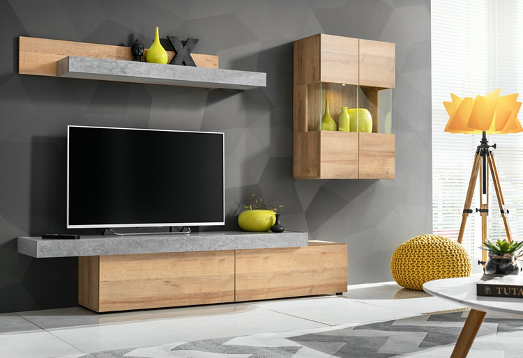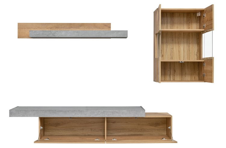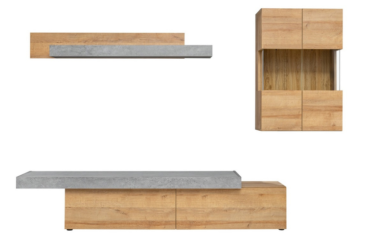 Moderní obývací stěna je navržena podle nejnovějších trendů. Sestava se skládá z: TV stolek (šxhxv) 190 × 40 × 40 cm, závěsná vitrína 60 × 30 × 90 cm a police 140 × 25 × 20 cm. Dvířka i korpus jsou vyrobeny z LTD desky v kombinaci dub riviera/beton. Součástí je LED osvětlení. Dodáváme v demontovaném stavu.
