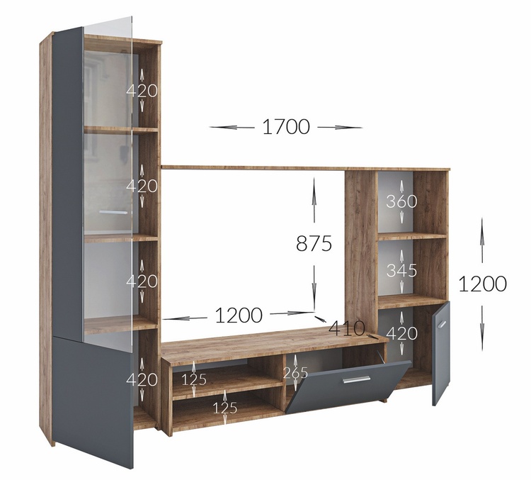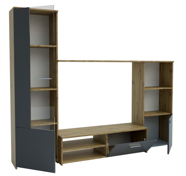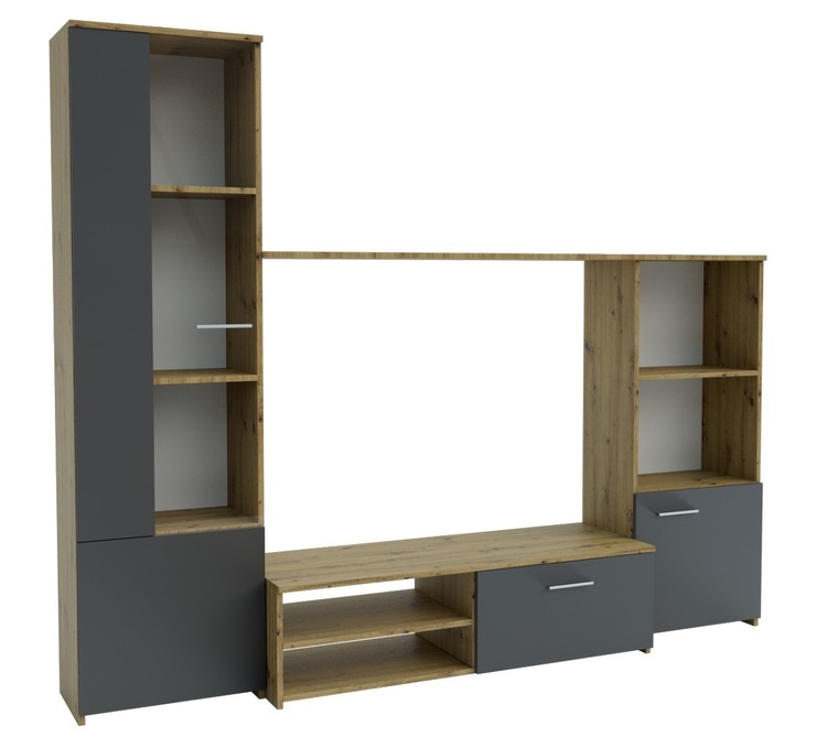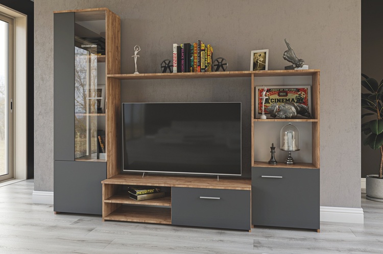 Obývací stěna v elegantním designu. Nábytek je v barevném provedení grafit šedý s dubem kraft tabaco. Nábytek je vyroben z kvalitního lamina vše hraněné ABS páskou. Lamino je odolné proti poškrábání, poškození, vlhkosti a vysokým teplotám. Sestava se skládá ( v/š/h ) – vitrína ( 179 × 50 × 31 cm ),tv stolek ( 30 × 120 × 41 cm ) a skříňka s policí ( 120 × 50–170 × 31 cm ). Nábytek dodáváme pouze jako sestavu v demontovaném stavu.