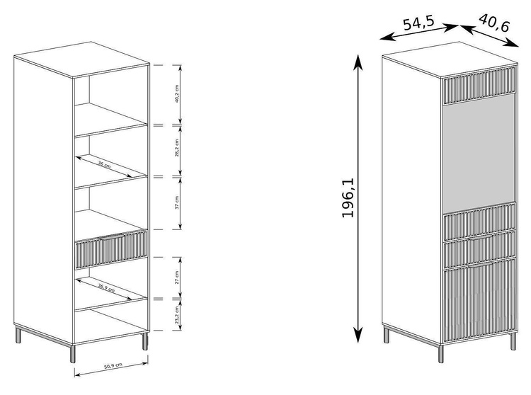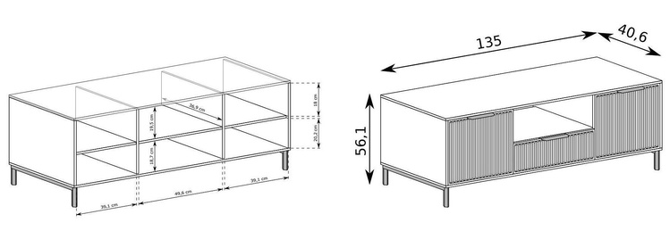 (135 × 40,6 × 56,1 cm) a police (120 × 18 × 32 cm).