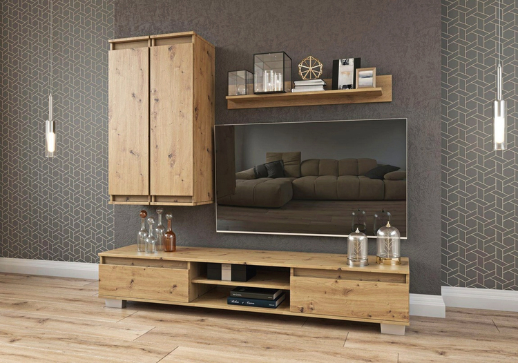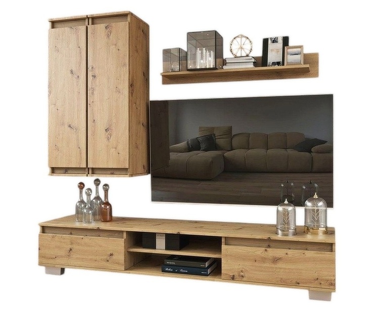 Levná obývací stěna v moderním barevném provedení dub artisan se stane výrazným prvkem každé místnosti. Nábytek je vyroben z kvalitního lamina hraněného melaninem. Sestava se skládá z ( šířka/hloubka/výška ) – televizní stolek se 2 zásuvkami ( 175,2 × 37 × 31 cm ),2× závěsná skříňka 1-dveřová... více informací o zboží